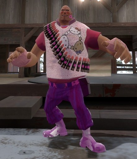 The Cuddly Heavy comes from the Team Fortress 2 mod TF2Ware. His aim is to give as many hugs as possible to the little babies of TF2, the scouts. But the heavy has one fault, his hugs... kill. This turned the fun loving room of the Boss Stage in TF2Ware into a murderous room of chaos, flying bodies, blood everywhere, masked with hearts and pink walls... the murderous side of the Heavy is present, even in his love.